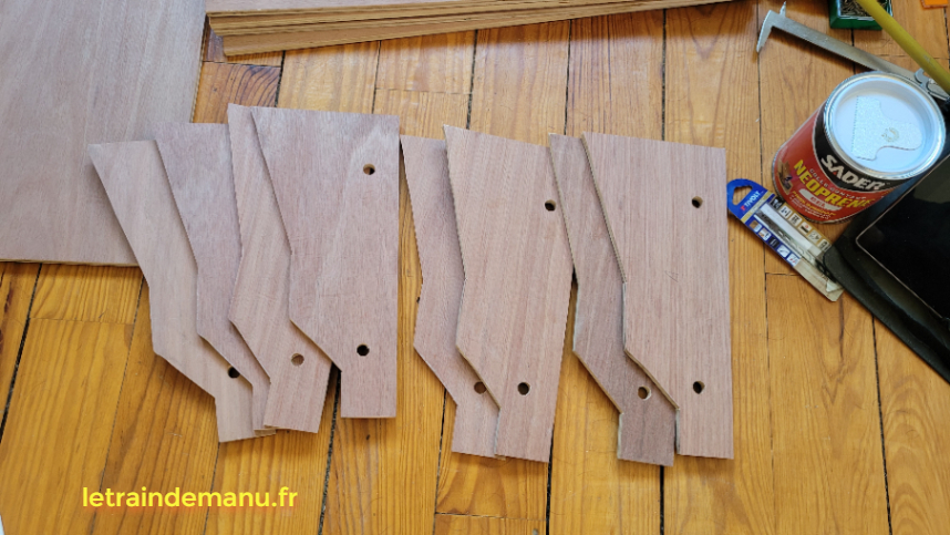 Après avoir confectionné un gabarit en Carton-Plume©, je le reporte sur mes huit morceaux de bois que je découpe à la scie sauteuse. Je perce ensuite les orifices ø 12 mm, les boulons de liaisons étant du ø 10 mm avec des écrous papillons.