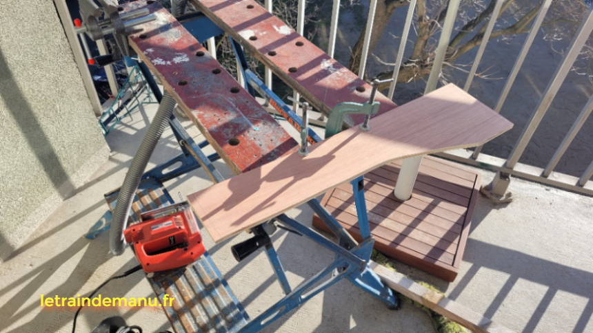 Photo 2577 : Découpe du fond de décor du Modulino d’extrémité gauche de la future gare. Source : letraindemanu.fr