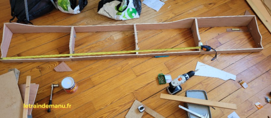 J’ai ainsi fabriqué les quatre premiers modules du futur réseau. D’une longueur identique de 58 cm, les les trois premiers à gauche recevront la future gare sur une longueur de 172 cm, de quoi disposer d’une voie principale et d’une voie d’évitement. Désirant conserver deux meubles de rangement, ces quatre premiers modules seront portés par deux tasseaux de grosse section.