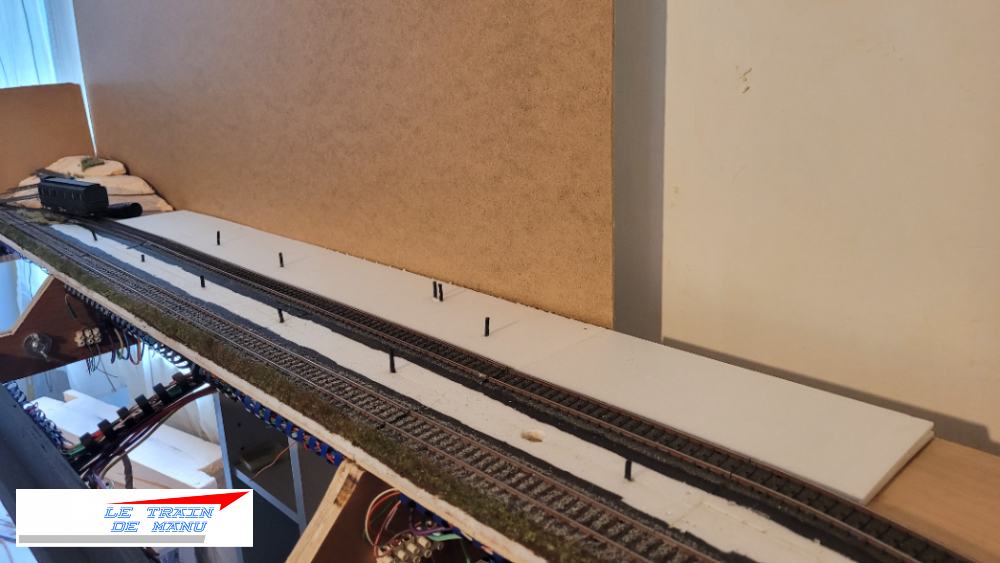 Le quai mesure 110 cm x 40 mm. Aux extrémités, le huit derniers centimètres sont poncés pour obtenir une pente douce. Dans mon cas, le quai est coupé en trois morceaux qui correspondent aux différents modules puisque la gare est installée sur trois Modulinos de 58 cm chacun.