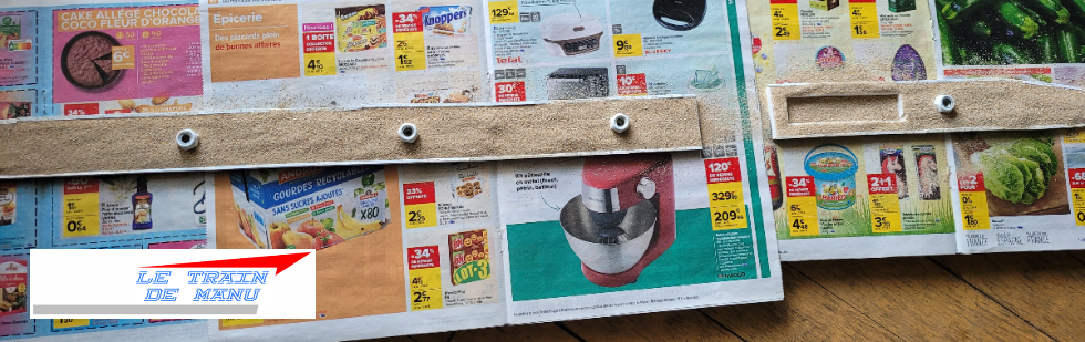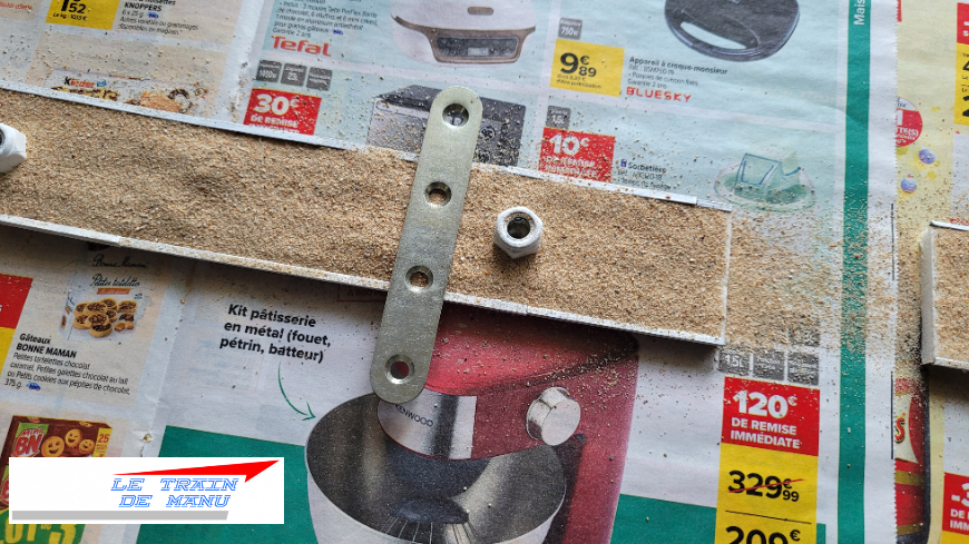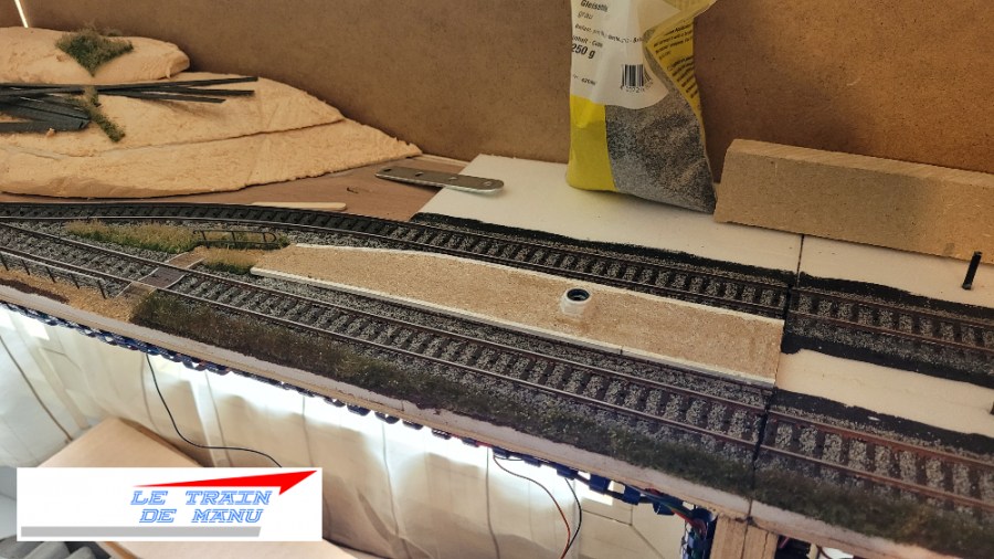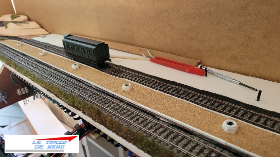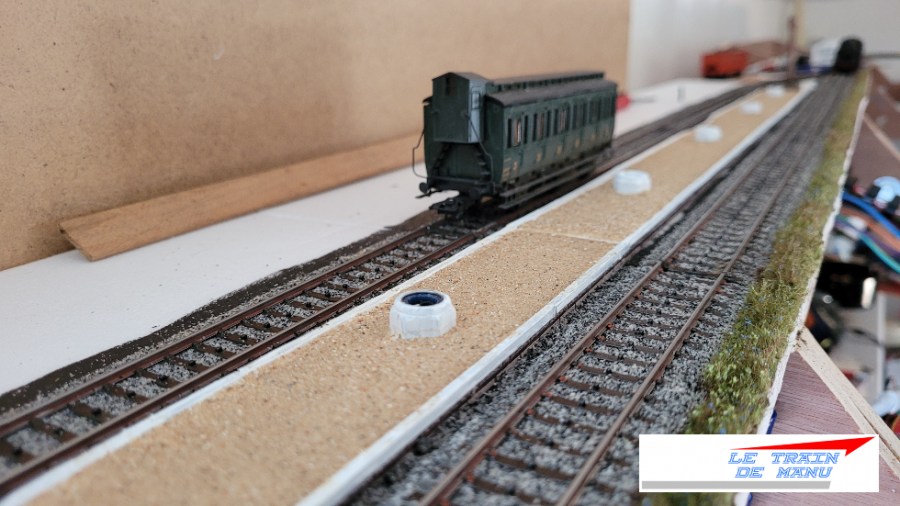 Le quai est ensuite collé à son emplacement sur une couche de colle vinylique non diluée. Une voiture avec marchepied et une locomotive à vapeur permettent de vérifier le libre gabarit. Des pattes métalliques posées à plat sur les bordures permettent de poser de petites boites de conserve le temps du séchage.