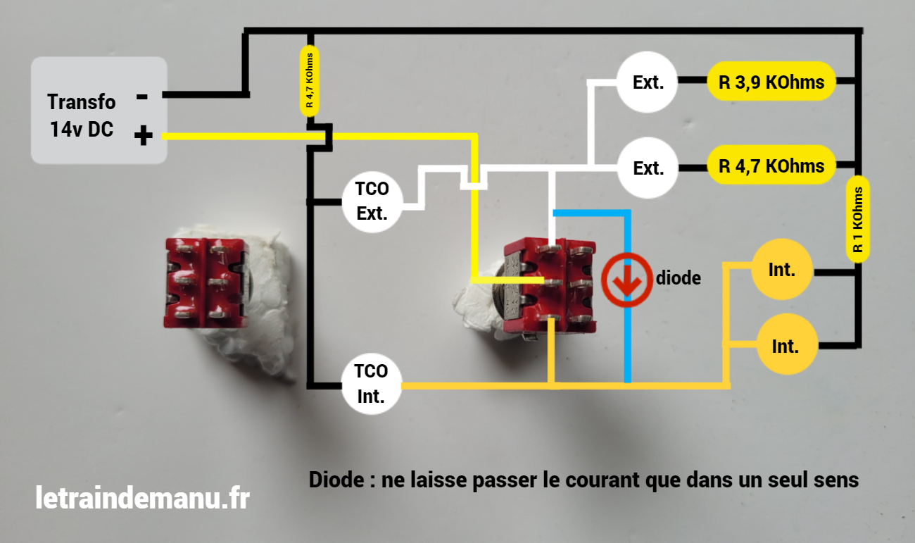 Le plus simple, c’est bien-sûr un interrupteur par circuit. J’ai fait un choix différent en utilisant un inverseur à point milieu : on/off/on. La position 1 éclaire seulement l’intérieur de l’usine, le point 2 allume tous les éclairages. Cela nécessite d’insérer une diode dans le câblage de l’inverseur.