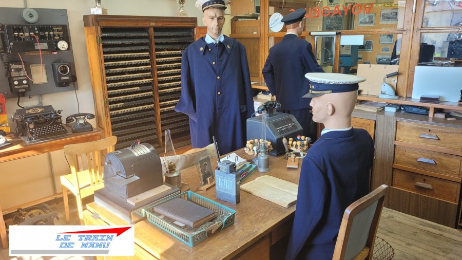A l’étage toujours, est présenté le bureau du chef de gare et les services administratifs. On note la présence de la pendule-mère, appareil qui permettait d’aligner les pendules des gares à l’heure de Paris. C’est en effet le train qui a permis d’uniformiser l’heure en France, puisqu’auparavant chaque région avait son heure… solaire.
