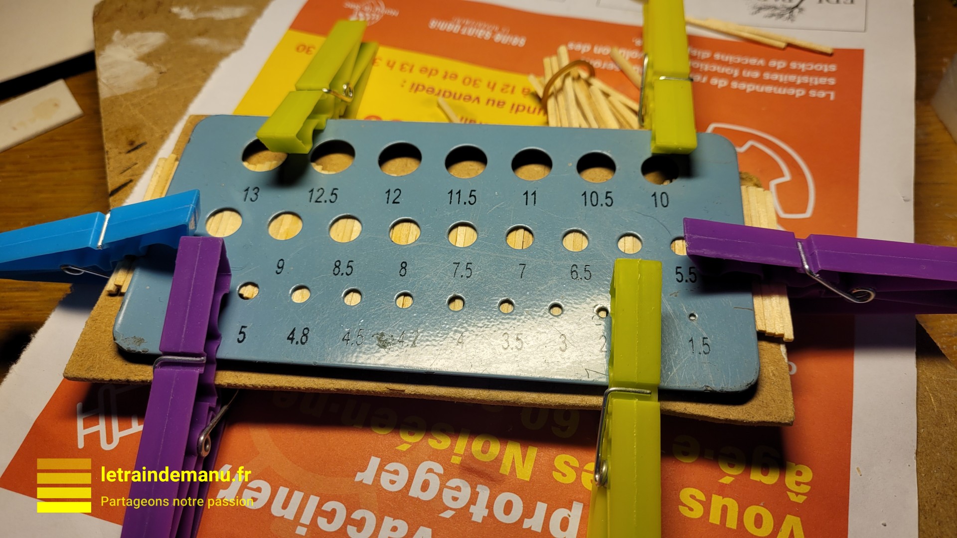 Photo 2778 : Réseau Ho, La partie droite du quai avant travaux. Photo 2779 : Fabrication de la palissade avec des allumettes. Photo 2780 : Mise sous presse. Photo 2781 : Mise en peinture des palissades. Source : letraindemanu.fr