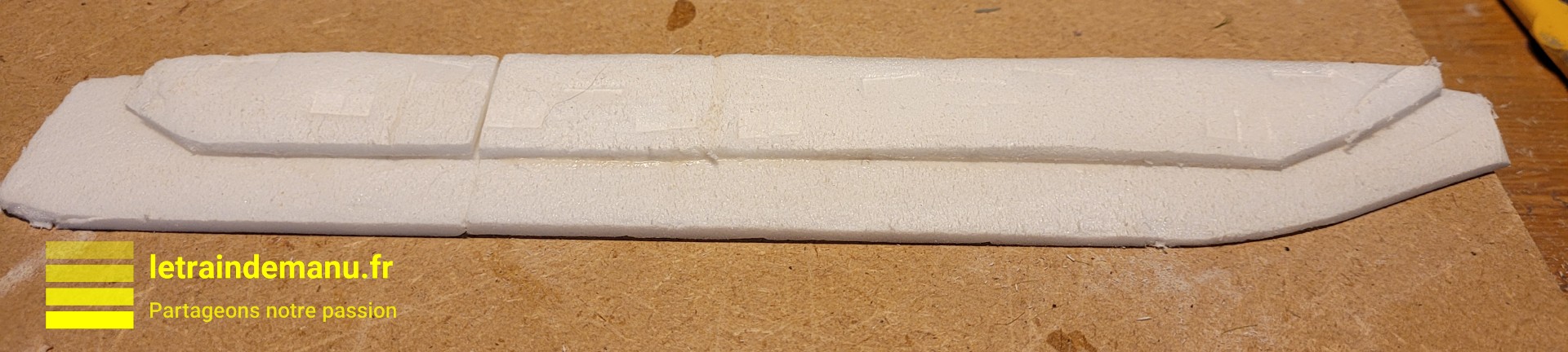 Il est simplement composé de deux couches de Dépron 3 mm dont les bords avant et les cotés ont été poncés avec une lime. Des bandes de verdures sont découpées aux bonnes dimensions dans un tapis de marque MBR 55-1010.