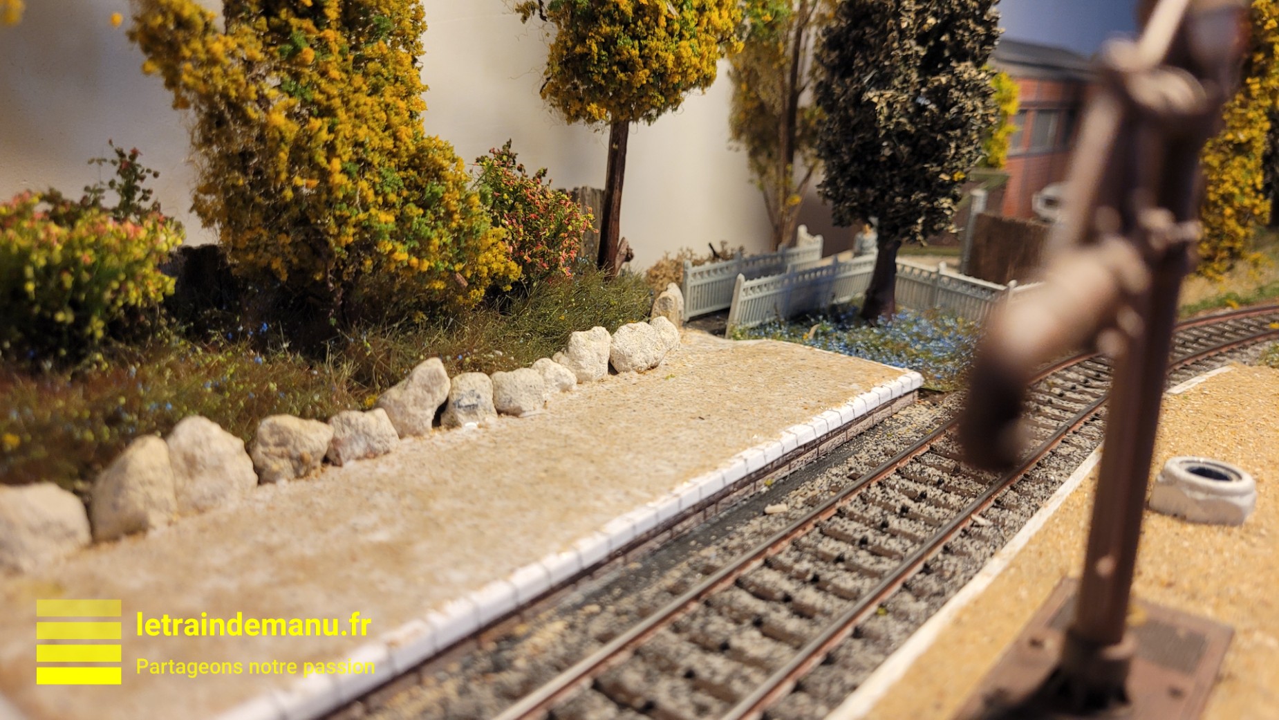 Dans les anciennes gares, les espaces végétalisés étaient fréquents. On rencontrait aussi des talus pentus avec parfois le nom de la gare ou de la ville à base de fleurs. Pour combler l’espace entre l’usine à droite et le bâtiment voyageur, j’ai donc opté pour un espace végétal surélevé.