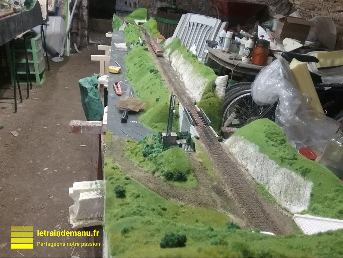 - Achèvement de la sortie de réseau coté pont pour créer l’impression que les trains disparaissent dans la campagne. Cet effet visuel a été réalisé en modifiant le relief, en rajoutant plus de végétation (grands arbres) et aussi en réalisant un fond de décor (chemin sur le pont), qui donne plus de profondeur et capte le regard.