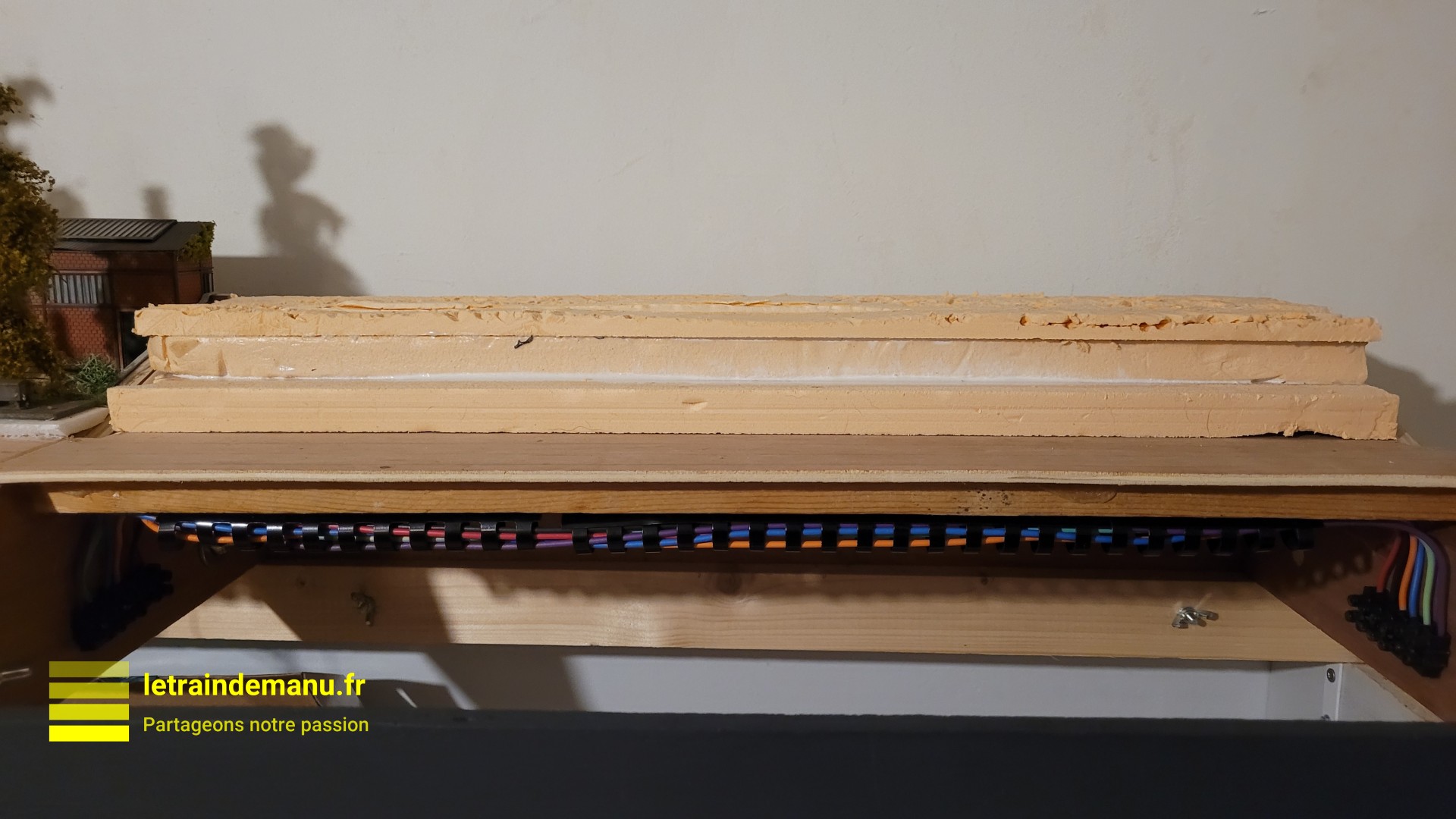 La voie C étant en ligne droite, sa pose ne présente pas de soucis particulier et reprend la technique détaillée dans l’épisode 214 : Raccordement mécanique à la voie C du Modulino 03, raccordement électrique au feeder traction à chaque extrémité du Modulino 04, voie collée à la néoprène en gel à proximité des raccords, puis sectionnement de la voie avec un disque monté sur le flexible de la Drémel. Les coupons sont ensuite vissés avec les vis ad hoc de la marque. Une bande de Dépron 6 mm est biseautée puis collée près de la voie du coté fond de décor pour diminuer l’épaisseur de la voie C Märklin / Trix. Le coté spectateur sera traité lors de la création du relief négatif.