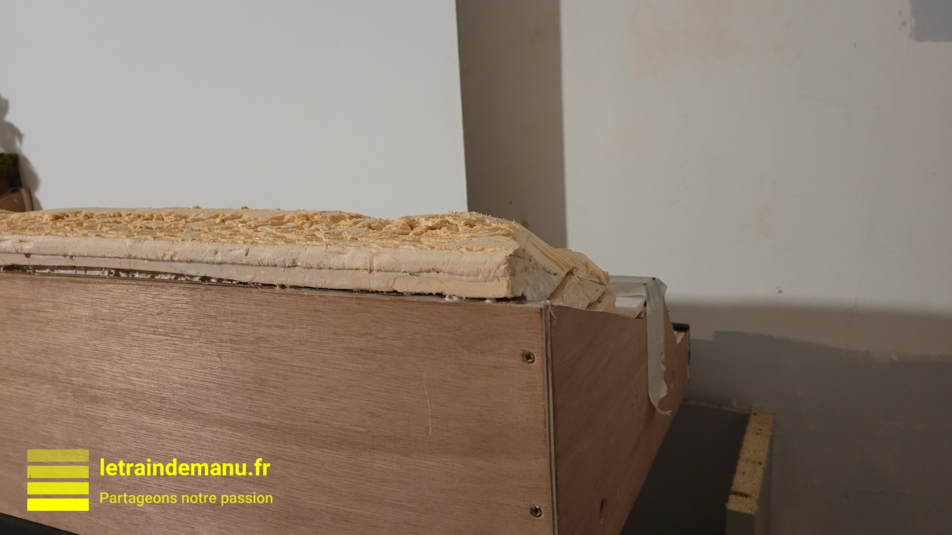 Le volume en polystyrène est collé à sa place définitive et recouvert de plâtre à modeler à l’exception de la planche supérieure qui sera la future voirie.