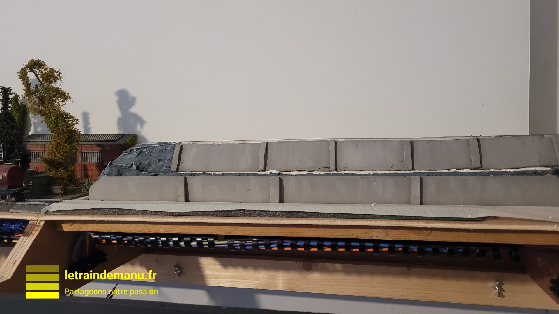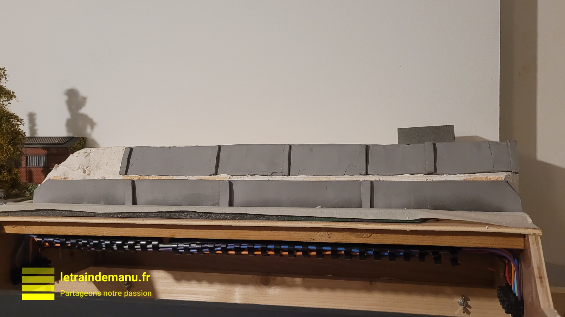 Deux murs de soutènement sont créés pour étager le décor et pouvoir ainsi insérer de la verdure. Les murs sont en pâte à modeler qui durcit à l’air. J’ai repris ici la technique déjà utilisée sur le pont mobile de l’ancien réseau. seule différence : les raccords sont en béton au lieu de renforts métalliques.