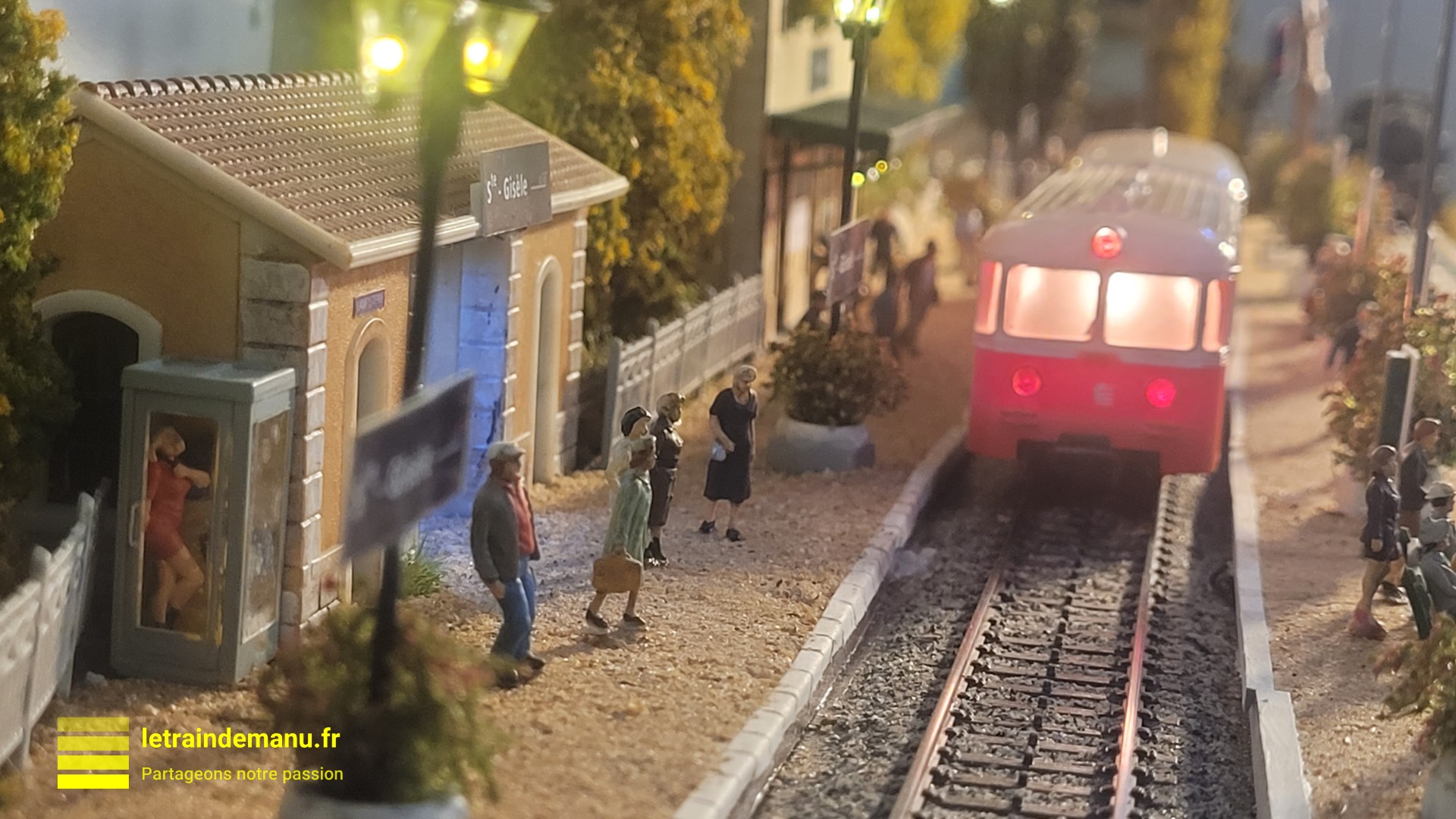 Après avoir longé le mur de soutènement d’où le bourg de Sainte-Gisèle surplombe la voie, l’autorail repeint aux couleurs de la compagnie de Vincent est entré en gare sur voie 2.