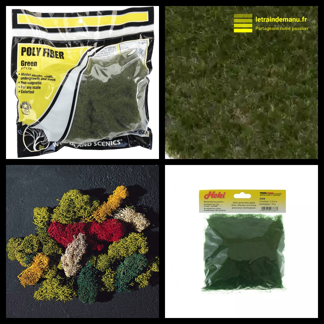 Photo 2947 : Poly fibre Woodland Scenics, Tapis végétal MBR Model, Lichen Faller et Flocage Heki. Source : letraindemanu.fr
