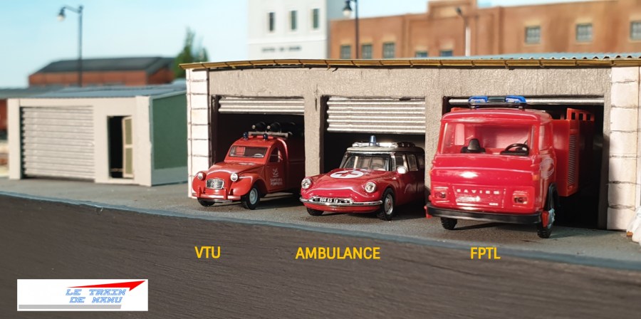 Si les scènes d’accidents (avec gyrophares) ou d’incendies (avec volutes de fumées et leds rougeoyantes) sont les plus fréquentes sur nos installations, la reproduction des centres d’incendies et de secours n’en est pas moins intéressante pour présenter, sur un minimum de surface, une grande diversité d’engins. De surcroît tout propres, donc sans besoin de les patiner.