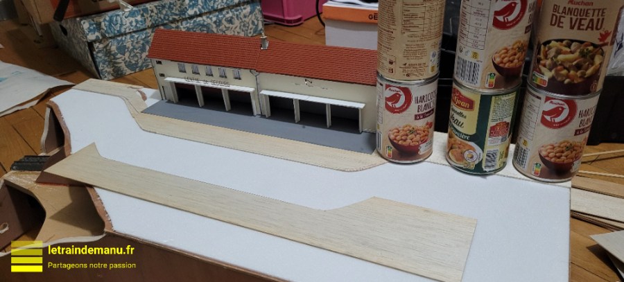 Photos 3109 : Confection d’un trottoir dans du balsa de 1,5 mm d’épaisseur. Source : letraindemanu.fr