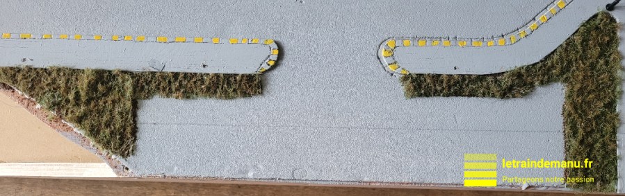 Le trottoir et l’ensemble de la surface en Dépron sont peints en gris à la peinture acrylique. Lorsque c’est sec, les bordures sont peintes en jaune Humbrol 69 avec un pinceau 5/0.