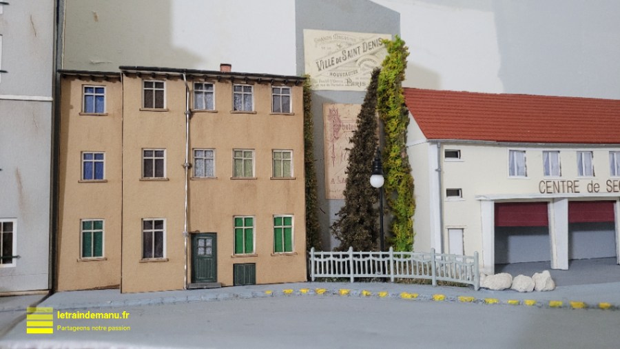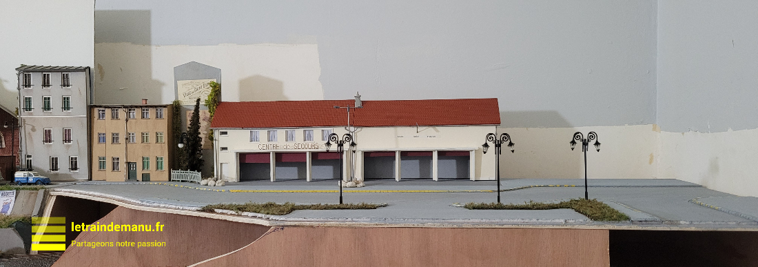 Entre la caserne de pompiers et le Modulinos 4, je recycle un immeuble de fond de décor Joswood et un mur issu de l’Hôtel du Nord, tous deux recyclés du module ZI Nord de mon ancien réseau.