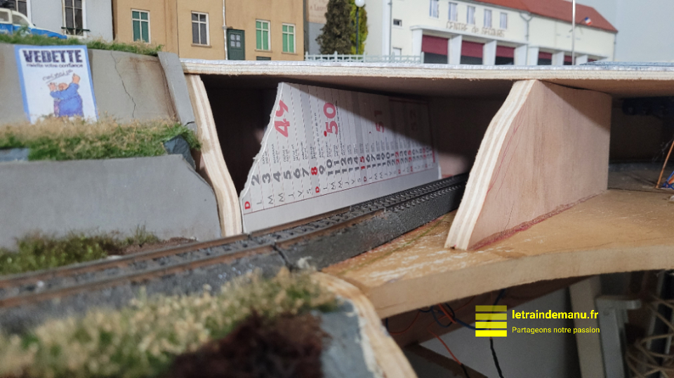 Cette version du module d’angle est bien plus esthétique que l’ancien « module aveugle » du réseau précédent, ce qui permet d’allonger le bourg. Lorsque je déménagerai, il me faudra réduire la hauteur des pieds du support de 10 cm : car si la voie principale est à bonne hauteur, pour le coup, ma ville est un peu haute.