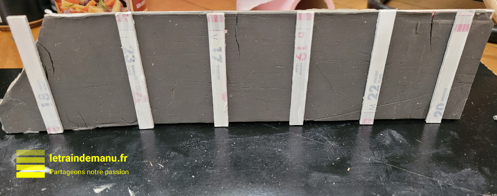 Si la paroi la plus proche du spectateur n’est pas visible de celui-ci, en revanche le mur opposé du tunnel l’est parfaitement. Il me faut donc l’habiller. Ce sera un mur béton semblable aux murs de soutènement. J’ai donc découpé un rectangle de carton calendrier de la hauteur du tunnel et d’une longueur de 16 cm. Je prépare une plaque de pâte à modeler qui durcit à l’air et la découpe aux dimensions de la plaque de carton. Compte-tenu des problèmes de rétractation rencontrés lors de la construction des murs précédents, je colle la plaque de pâte à modeler sur la plaque de carton avec de la colle vinylique prise rapide et mets le tout sous presse entre deux plaques de bois et des serre-joints. Je laisse sécher 24 heures.