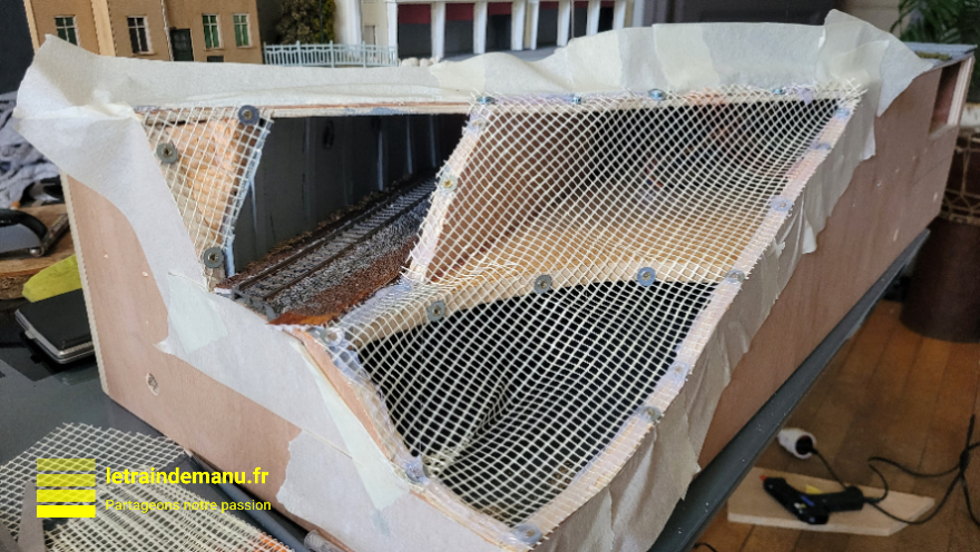 Photo 3141 : Pose du grillage pour le relief négatif sur le module 05 Source : letraindemanu.fr