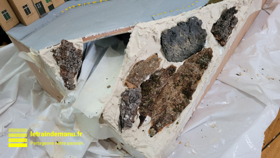 Photos 3143 et 3144 : Peinture du plâtre et des écorces sur le relief négatif du module 05. Source : letraindemanu.fr