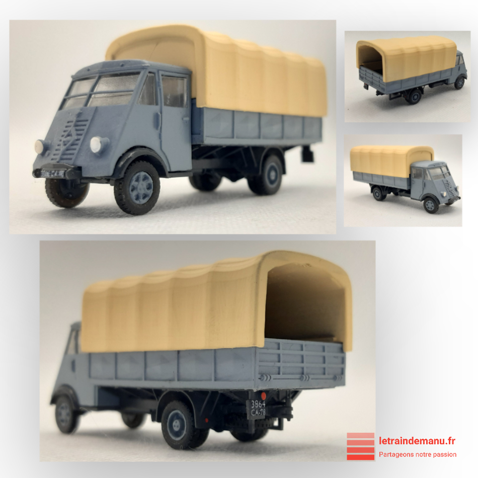 Photos 3156 et 3157 : Le Renault AHR original et la version plateau à ridelle bâché en Ho réalisée par Keta Boulet. Source : Keta Boulet pour letraindemanu.fr