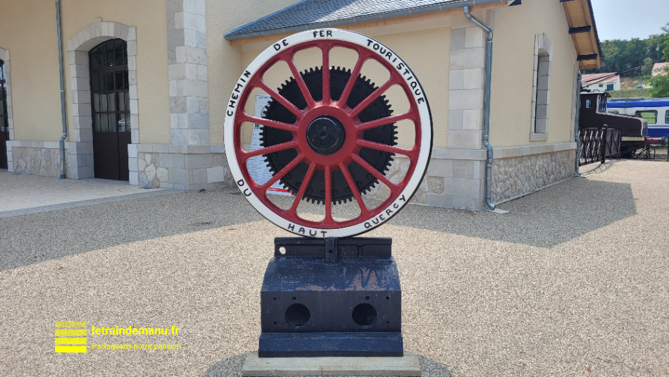 Photo 3174 : Enseigne du Chemin de Fer Touristique du Haut-Quercy devant l’ancienne halle à marchandises devenue bâtiment voyageurs de la compagnie. Juin 2023.  Source : letraindemanu.fr