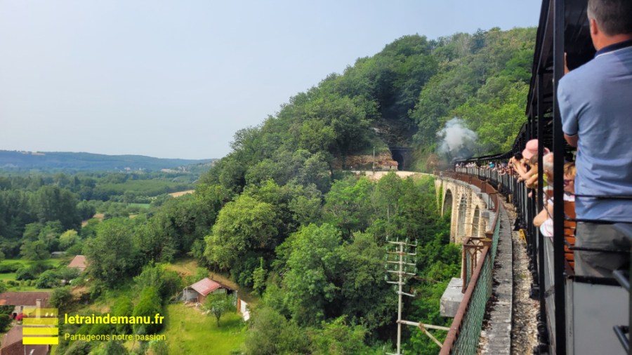 Photo 3175 : Chemin de Fer Touristique du Haut-Quercy , sur le viaduc des Scourtils, une rame tractée par la locomotive à vapeur 040 T 17. Juin 2023.  Source : letraindemanu.fr