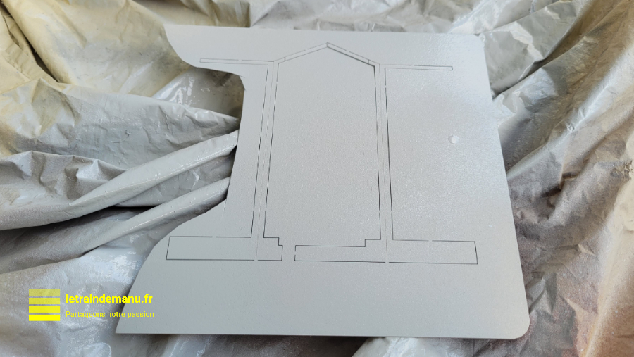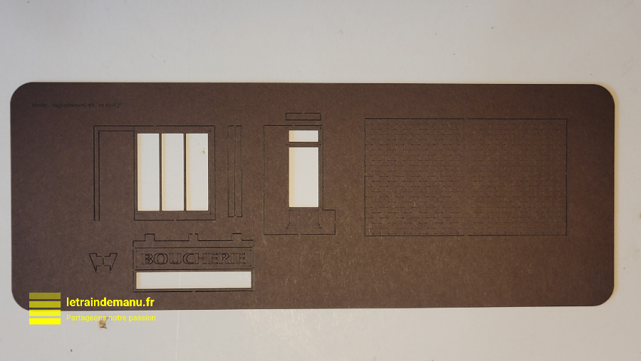 Suggestion : Minifer pourrait proposer une option avec cette fois les lettres découpées dans le support boiserie (pièce 13). Avec la pose d’un papier sulfurisé, d’un calque ou fine feuille blanche, on pourrait alors glisser une ou deux leds CMS afin d’obtenir une enseigne lumineuse. Il devrait y avoir la place sur la planche d’origine sous le toit.