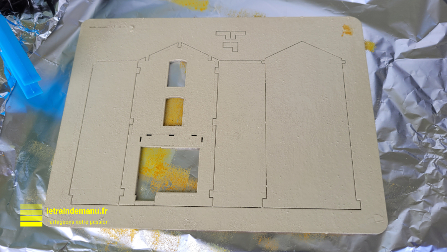 Matériel nécessaire : Bombes de peinture gamme modélisme couleur au choix. Le recours à des bombes de peintures (ou aérographe) est ici indispensable au risque de dénaturer la gravure ou d’abîmer les pièces en carton. Peinture possible au rouleau mousse sur les murs porteurs. Vernis mat en bombe