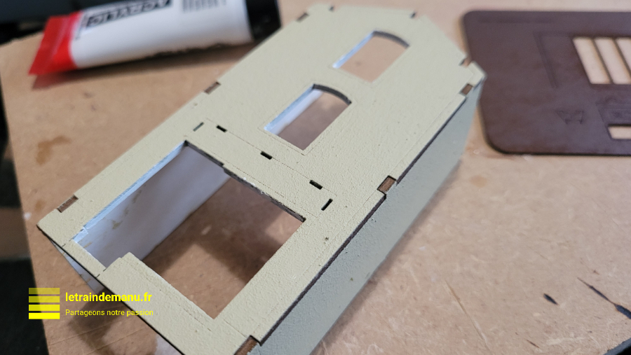 Le montage des murs ne pose aucun souci. Tout s’emboite parfaitement. J’ai collé avec de la cyanoacrylate Colle21 appliquée avec son embout bleu fin. On ne colle pas le mur du fond puisqu’il faudra intervenir à l’intérieur du bâtiment par la suite.