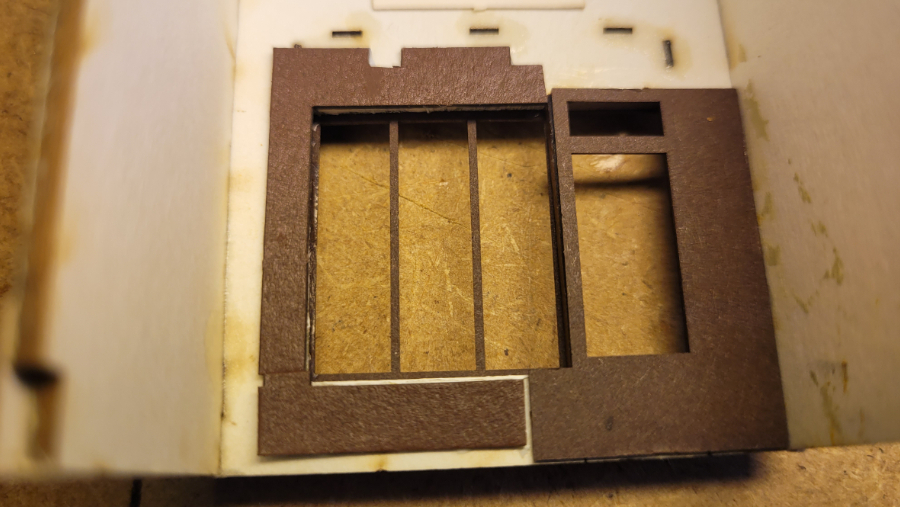 La grappe marron est coupée en deux pour séparer le toit du reste de la planche (je reviendrai sur la toiture ultérieurement). La partie vitrine est peinte en marron cacao.