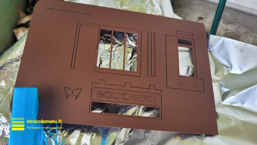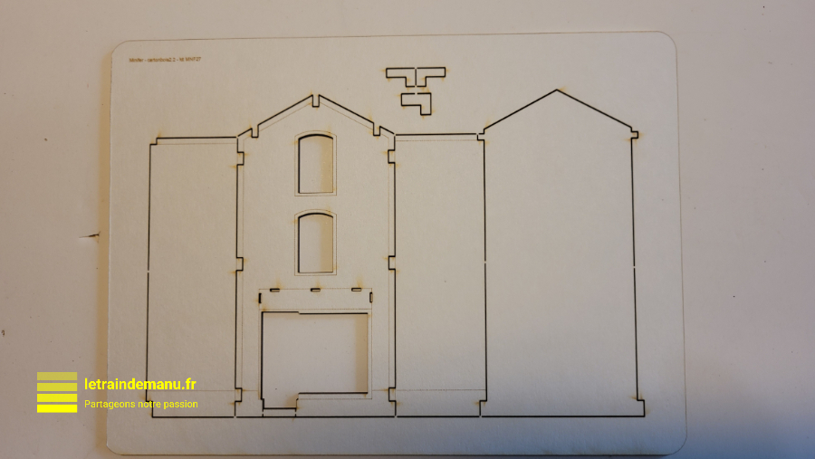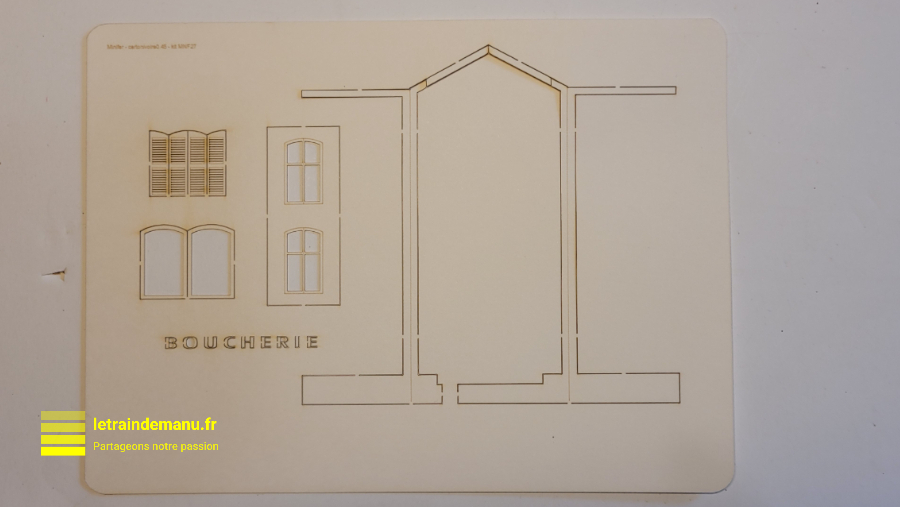 Suggestion : Minifer pourrait proposer une option avec cette fois les lettres découpées dans le support boiserie (pièce 13). Avec la pose d’un papier sulfurisé, d’un calque ou fine feuille blanche, on pourrait alors glisser une ou deux leds CMS afin d’obtenir une enseigne lumineuse. Il devrait y avoir la place sur la planche d’origine sous le toit.