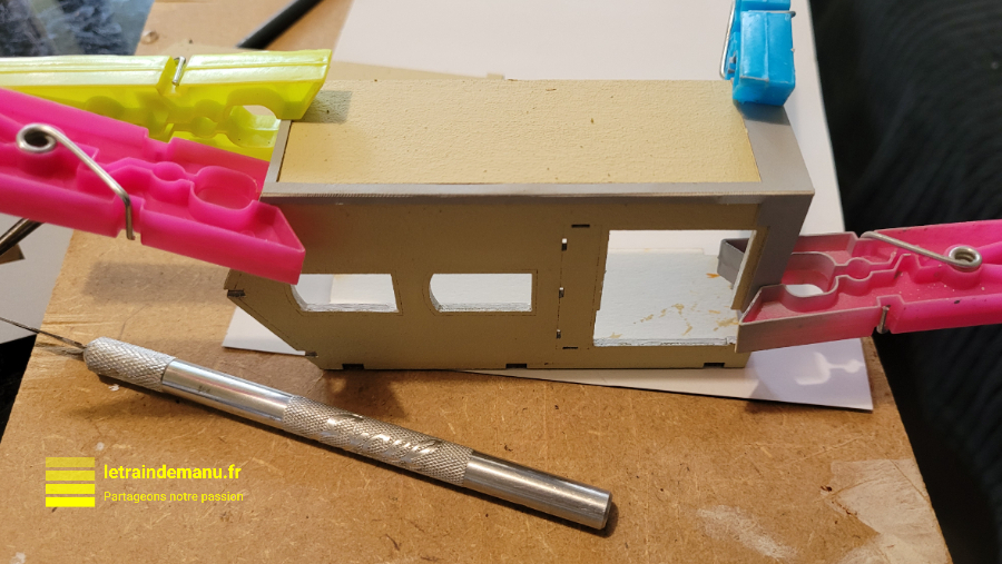 Il faut d’abord plier les angles : on pose le parement sur le dos d’une lame de cutter pour former un angle droit. Les parements sont ensuite collés à la colle à bois prise rapide appliquée au pinceau pour permettre un bon ajustement. Des pinces à linge maintiennent les pièces lors du collage.