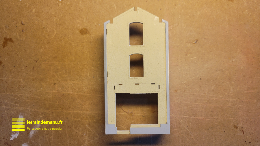 La grappe marron est coupée en deux pour séparer le toit du reste de la planche (je reviendrai sur la toiture ultérieurement). La partie vitrine est peinte en marron cacao.