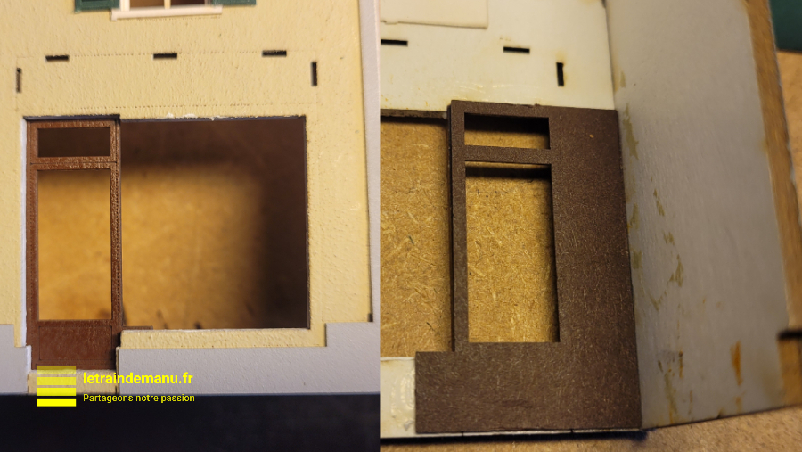 On commence par coller la porte depuis l’intérieur. Puis on colle les encadrements extérieurs de la porte du commerce. Enfin, on colle, l’extérieur, l’encadrement de la vitrine.