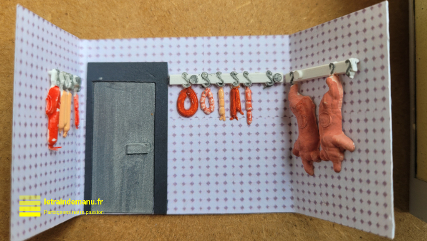 Il me restera à poser gouttières et descentes d’eau pluviale dès lors que j’aurais une meilleure visibilité sur les futurs immeubles mitoyens. En effet, cette boucherie est plus petite que je l’imaginais et donc ne sera pas implantée à l’endroit initialement prévu. Par ailleurs, elle devra être installée plus vers le centre du dépôt pour mieux profiter de son aménagement intérieur, face au spectateur. Il me faudra trouver une cheminée adaptée dans mon stock et installer l’éclairage. Une petite patine viendra finaliser cette sympathique maquette.