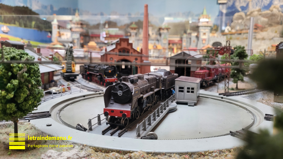 Un immense réseau au 1/32e (France-Angleterre), surplombé par une mezzanine au sol vitré. Là encore, tout le décor est fait maison et a nécessité 4 années de construction.