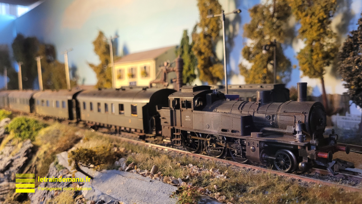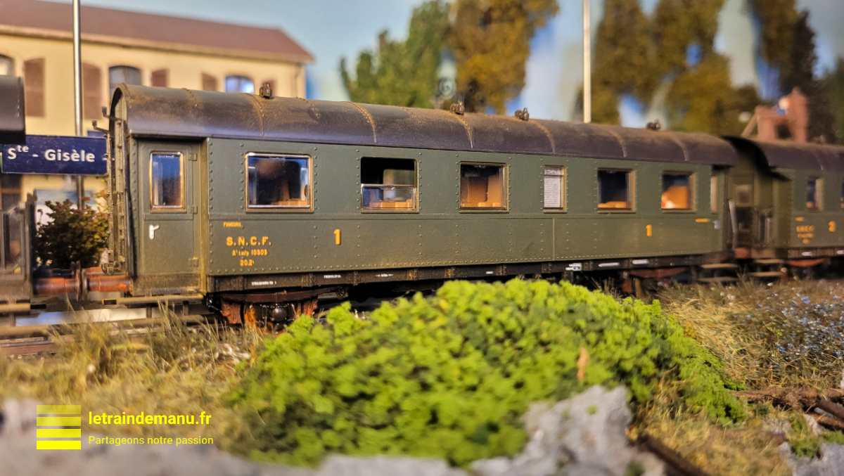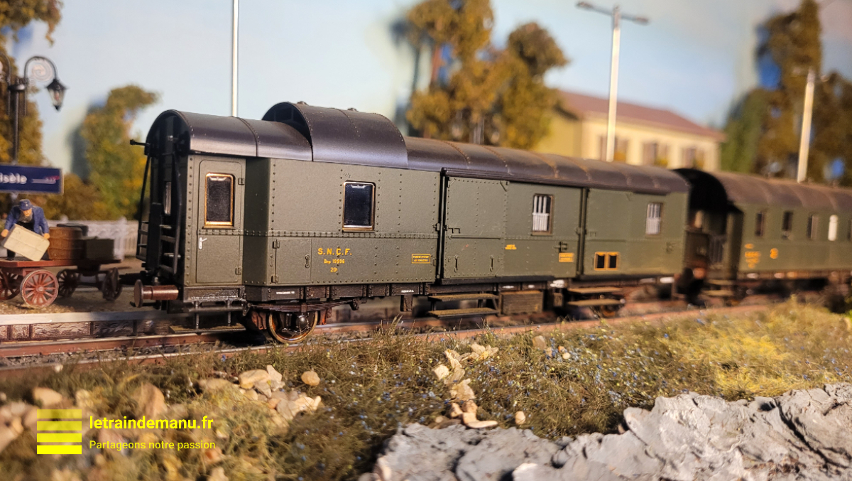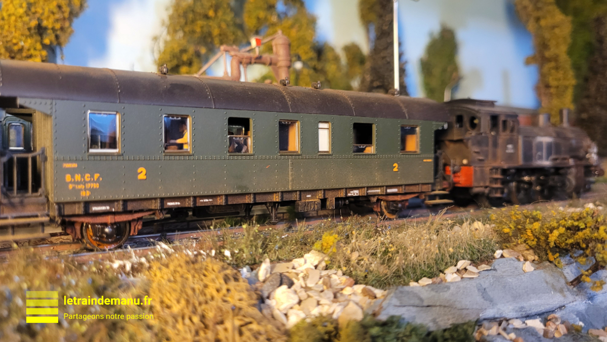 Elle a bien-sûr été immédiatement envoyée à l’atelier peinture pour y recevoir une légère patine ainsi que quelques voyageurs. Il ne lui manquent plus que des feux de fin de convoi.