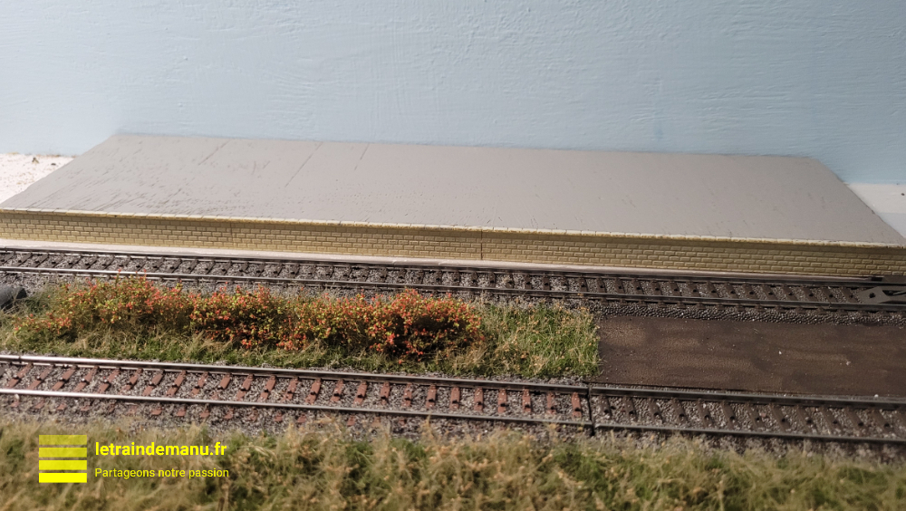 La bordure en pierres, côté voie, est simplement récupérée sur un vieux kit halle à marchandises Jouef que j’avais dans ma boite à rabiots. Cette bordure a été peinte en ocre claire avec une bombe de peinture.