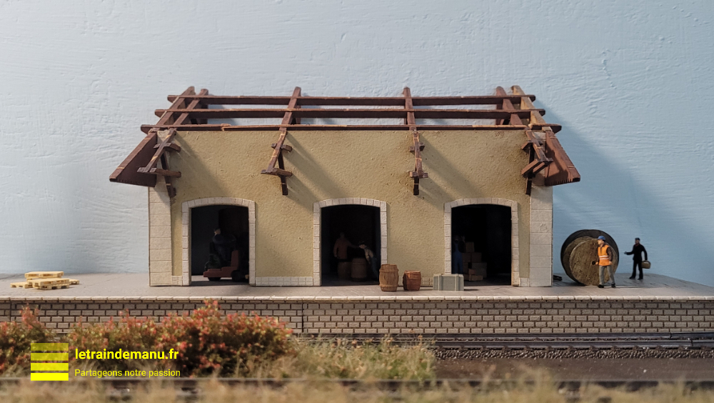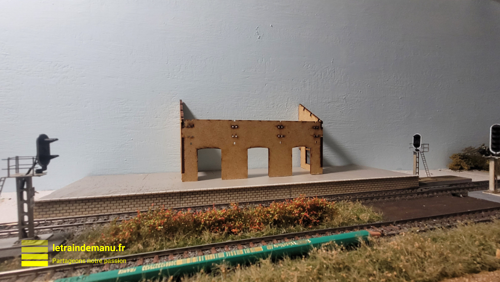A noter : Compte tenu de la configuration de mon quai et de l’emplacement de la halle sur celui-ci, cette dernière est plus en retrait de la voie que prévu avec le modèle original. C’est un choix personnel que j’assume.