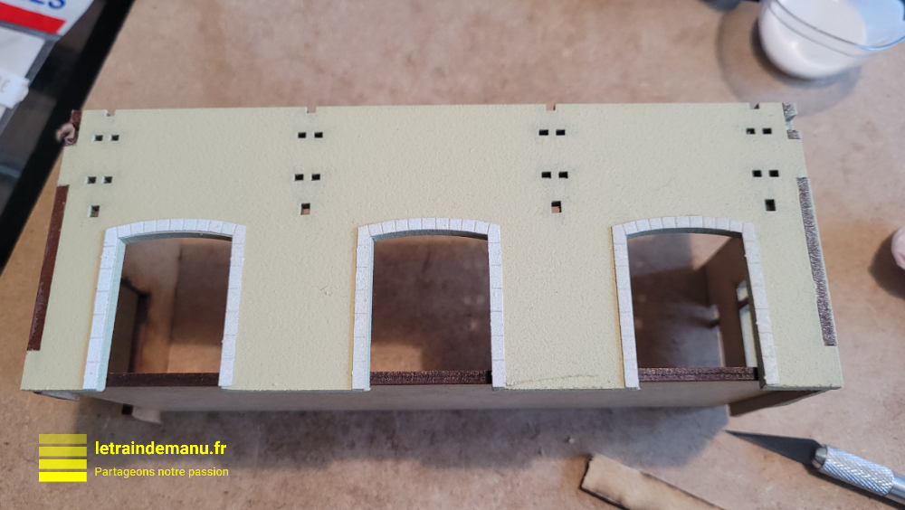 Les huisseries sont fragiles. On les dégrappe, au besoin on les ponce légèrement. On les insère par l’arrière et elles sont collées avec un peu de colle vinylique au pinceau. Rien de compliqué, il faut être soigneux. On installe ensuite les vitrages, également avec une pointe de colle vinylique.