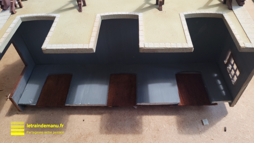 Ma maquette va être placée contre un fond de décor. Souhaitant la présenter portes ouvertes, je n’ai d’autre choix que de confectionner un mur arrière et un plafond pour ensuite y ajouter un éclairage intérieur.