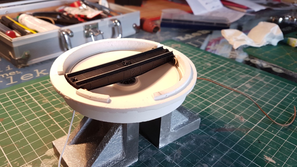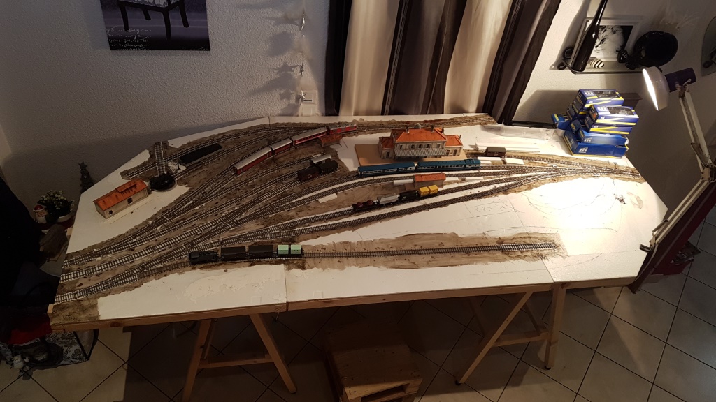 La voie, en code 75, est posée sur des plaques de Dépron. La plupart des traverses ont été travaillées, peintes et posées une à une. Puis les moteurs d’aiguilles, Péco, sont câblés. Le ballast est issu d’une carrière qui produit du vrai ballast pour le RFN. Puis tamisé à plusieurs reprises. Dans le même temps, Gauthier débute la fabrication du TCO. Fin 2016, un quatrième plateau vient prolonger les trois précédents. La pose et le ballastage de la voie prendra presque deux ans.
