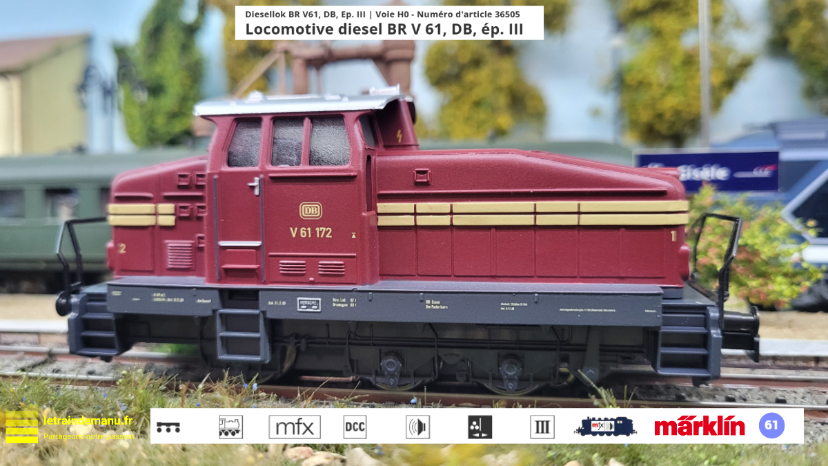 Modèle réel : Locomotive de manœuvre diesel de la série fictive V 61 de la Deutsche Bundesbahn. Le succès de la DHG 500, livrée par Henschel à Kassel, auprès des chemins de fer privés et industriels n’échappa pas à la grande Deutsche Bundesbahn. D’un point de vue moteur, les machines de la série DHG 500 étaient nettement plus modernes que les locomotives diesel de la série V 60, dont l’entraînement était assuré par bielles et arbre secondaire de renvoi. L’entretien exigeant de ces machines en termes de personnel et de coût décida la Deutsche Bundesbahn à imiter les chemins de fer privés et industriels en commandant à Henschel quelques-unes des locomotives désormais immatriculées comme série V 61.