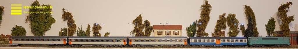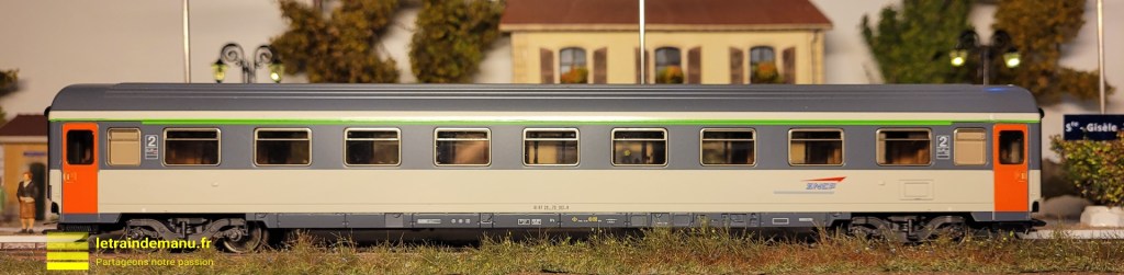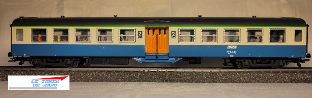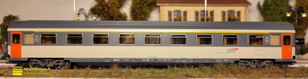 Voiture SNCF type Corail 1ère classe A9u, immatriculation no 61 87 19-70 960-1. Modèle au 1:100ème en longueur (L=26,4 cm)