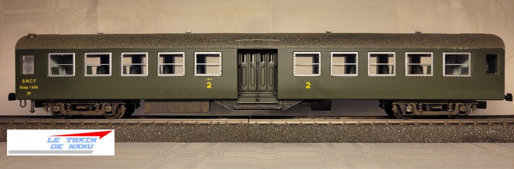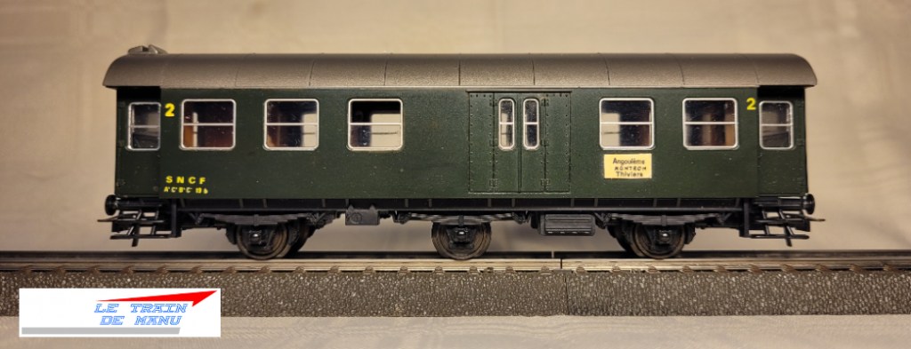 Voiture modernisée à trois essieux de la SNCF en livrée d’origine verte à toit gris. 2ème classe