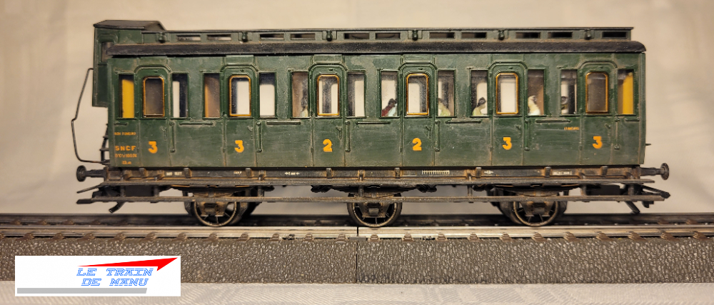 Voiture à portières latérales à trois essieux de la SNCF en livrée d’origine verte à toit noir. Guérite de serre-freins. 2ème / 3ème classe