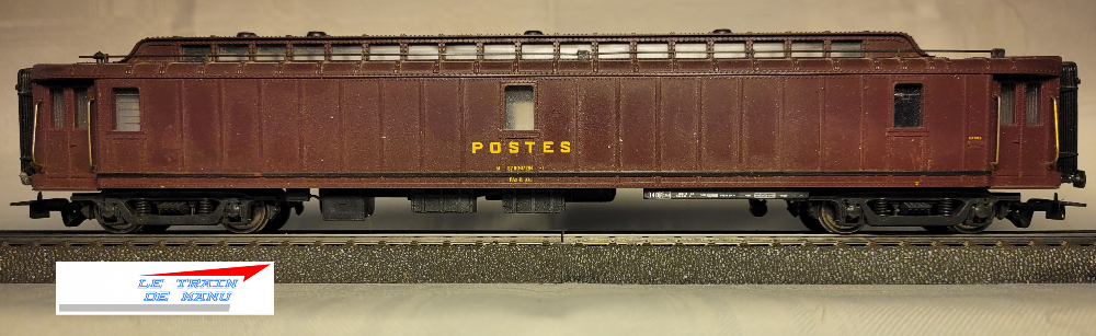 Voiture bureau ambulant postal SNCF en livrée d’origine bordeaux PTT et châssis noir.
