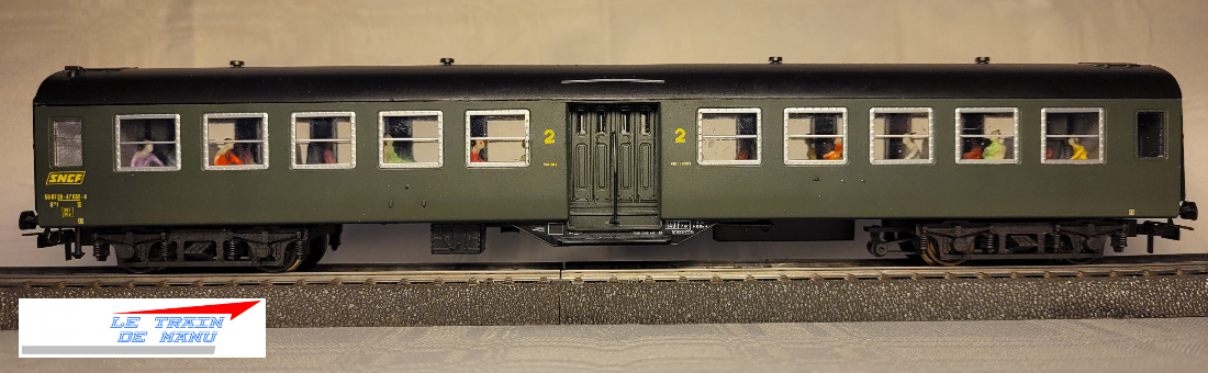 Voiture modernisée à trois essieux de la SNCF en livrée d’origine verte à toit gris. 2ème classe